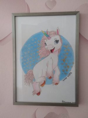 Op het moment dat haar kamer klaar was, kreeg ze deze tekening. super blij was ze. Ze heeft een speciaal plekje op de muur aangewezen waar de eenhoorn mocht hangen.
