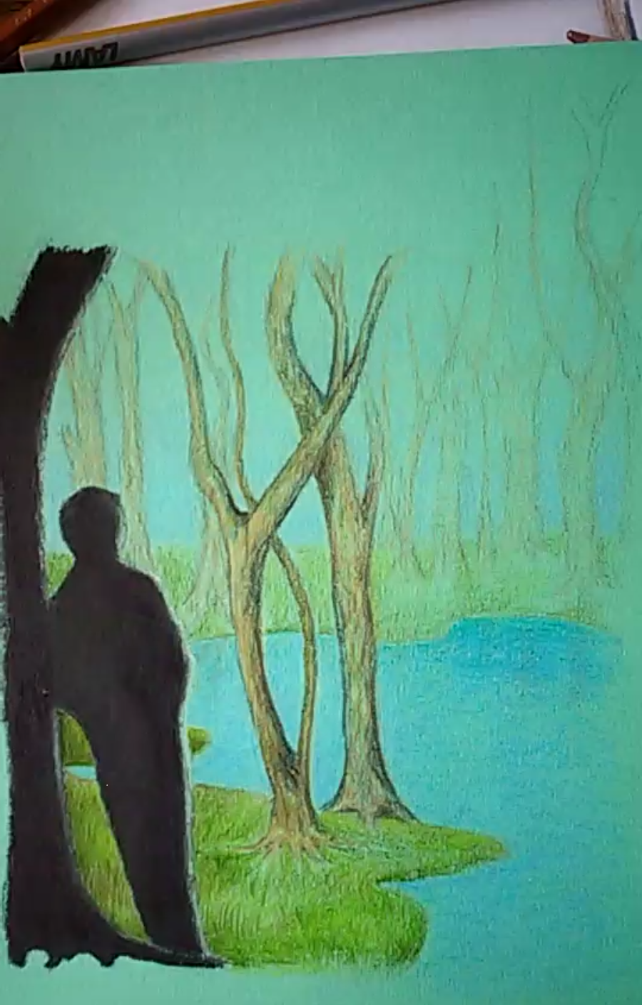 De mist heb ik terplekke toegevoegd voor nog meer mysterie. De achtergrond kleur, de sfeer en de hoofdrolspeler steunend tegen de boom waren voor haar zoals ze het verhaal voor ogen zag.